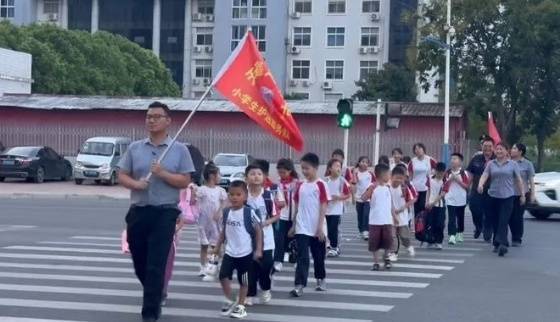 r下午四点半,漯河市某小学门口几名物业工作人员手持队旗,组织小区业主的孩子排队放学,这是河南润嘉物业“小学生护送队”每天的工作场景。