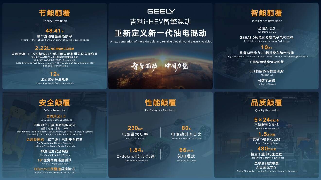 吉利汽车集团近日正式推出全球新一代AI油电混动技术——i-HEV智擎混动,以五大核心技术突破重新定义混动出行标准。这项技术通过全域AI 2.0架构深度整合动力系统与三电技术,实现百公里综合油耗低至2.22L、发动机热效率48.41%的行业领先水平,并成为全球首个获得HEV车型1级能效认证的技术方案。其搭载的星睿AI云动力2.0大模型可实时感知环境数据,智能优化油电分配策略,在城市通勤场景中可降低发动机低效运行时间,实现越堵越省油的突破。